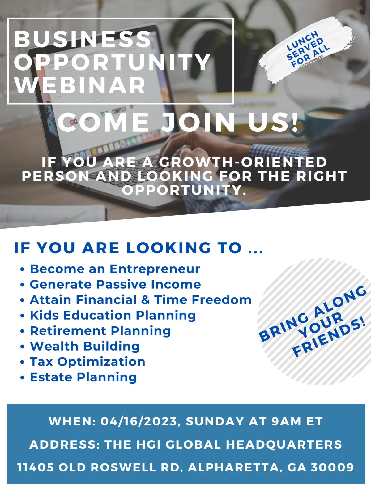 Join our Business Opportunity Workshop to discover how to start your own business in the financial industry. We’ll share Tips on Retiring Early and review Personal Financial Goals with tailored solutions. Gain insights and take actionable steps toward financial independence. Don’t miss this opportunity!